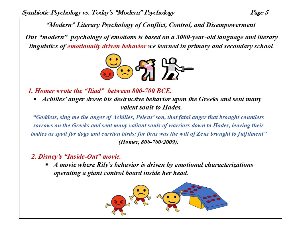 Is the psychological “science” of emotional regulation, control, and management (that is, “emotions drive behavior” and therefore “dangerous emotions can drive destructive behavior”) based in logic and research? Or are these paradigms of beliefs of “emotionally driven behavior” but an unquestioned and accepted neurolinguistic programing of Homer’s literary linguistics inscribed in his “Iliad” nearly 3000-years-ago? The theory of “emotional dysfunction and disorder” may have a successful scope of understanding… like a flat Earth road map is successful. But, if circumnavigating the globe, flat Earth technology is useless. An investigation into the limiting “science” of literary defined emotionally driven behavior is in order.
