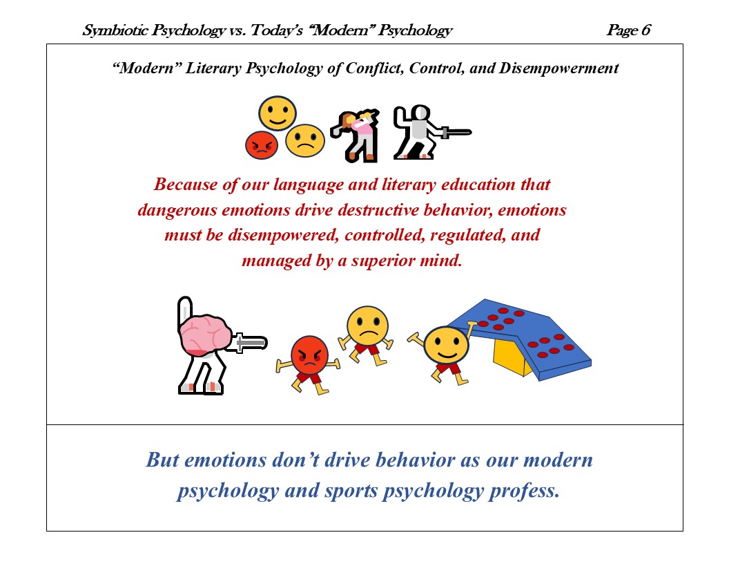 Instead of the today’s “current” sports psychology based in academic’s literary 3000yr old “mental toughness” (masculine mind controlling the feminine emotional body) ideology, we are in a new age of Symbiotic Psychology where the marriage between mind and emotion is a harmonious movement and perpetual dance of wondrous creation.