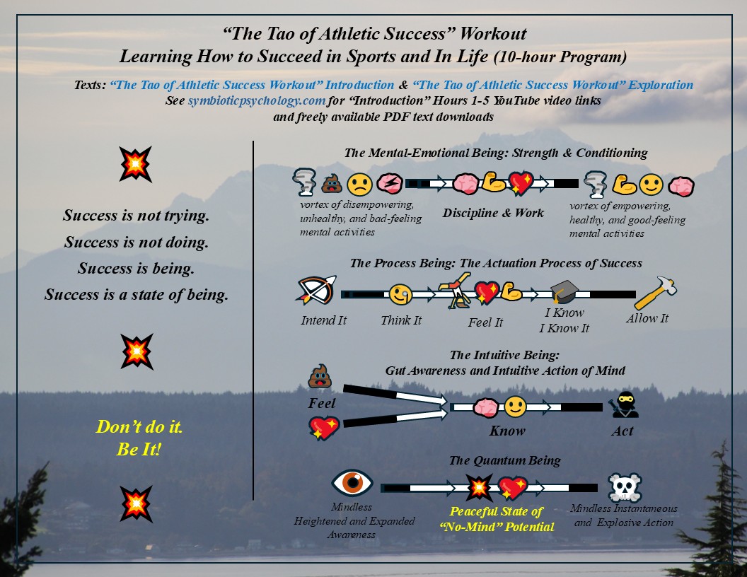 “The Tao of Athletic Success Workout” (immediately below) is a new sports performance psychology based on millions of years of evolutionary survival of the fittest, strongest, most agile and most powerful and clever and their evolved symbiotic harmony of mind, body, emotions, and awareness within a personal power of Qi. “The Tao of Athletic Success Workout” is a freely available self-directed 10-hour program with “Introduction” Videos for hours 1-5 available on YouTube. Hours 6-10 are a freely available instructional, fill-in-the-blank “Exploration” text that further develops an athlete’s skills, abilities, and understandings of their “Quantum Being” nature beyond their Newtonian linear time and 3D spacial awareness, strengths, and power.